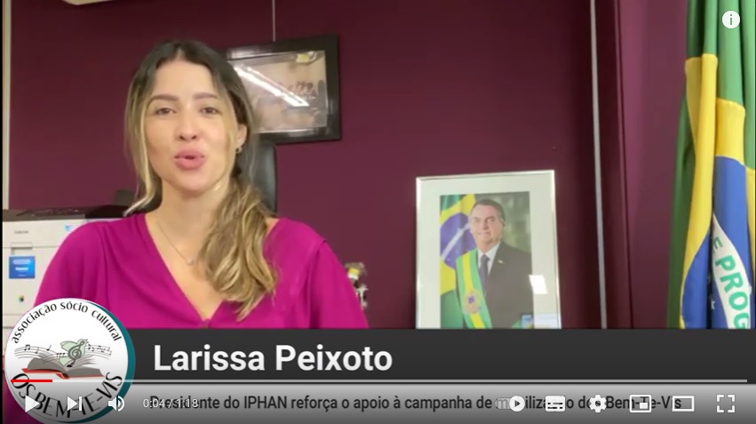 Enfatizando o apoio especial do IPHAN à campanha de mobilização de recuperação dos bens sacros furtados da Igreja Matriz de Santo Antônio de Itatiaia, Larissa Peixoto, atual presidente do IPHAN, faz um apelo em favor da campanha realizada pela Associação Sócio Cultural Os Bem-Te-Vis, incentivando pessoas de todo Brasil a colaborarem com informações.